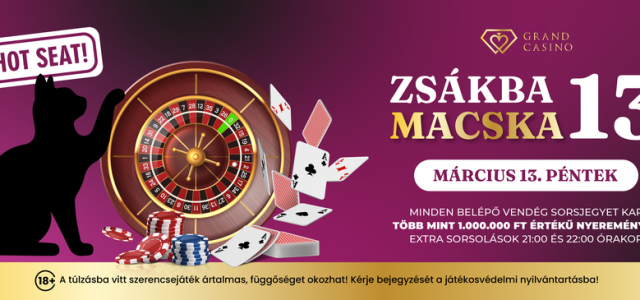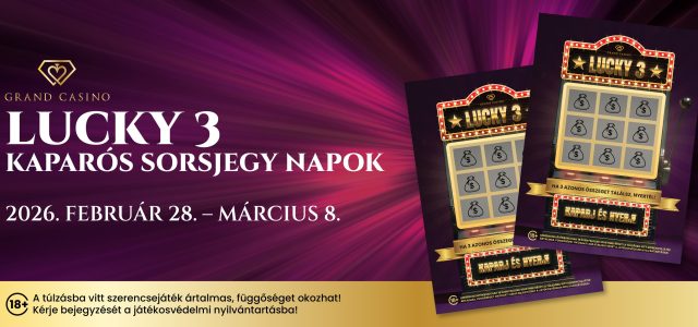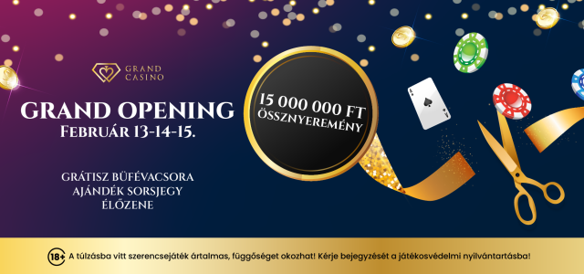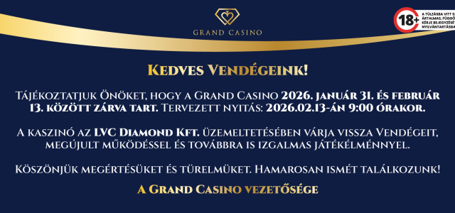 Kedves Vendégeink! Tájékoztatjuk Önöket, hogy a Grand Casino 2026. január 31. és február 13. között zárva tart. Tervezett nyitás: 2026.02.13-án 9:00 órakor.