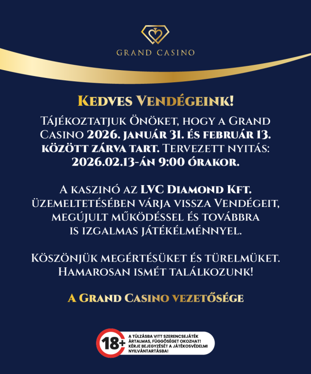 Tájékoztatjuk Önöket, hogy a Grand Casino 2026. január 31. és február 13. között zárva tart. Tervezett nyitás: 2026.02.13-án 9:00 órakor.