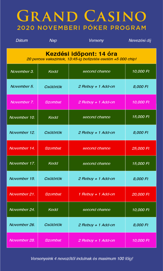 Pókerversenyek minden kedden, csütörtökön és szombaton! A 23 órás zárás miatt a versenyek már 14 órakor kezdődnek!