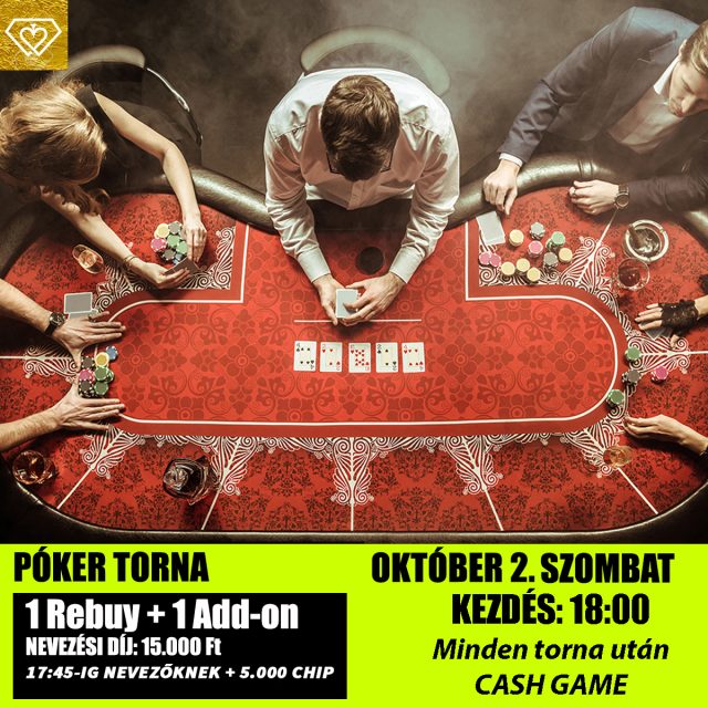 Október 2-án szombaton 15.000 Ft-os 1 Rebuy + 1 Add-on pókerversennyel várjuk vendégeinket!