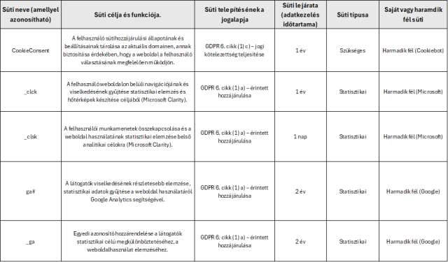 A táblázat tartalmazza a Weboldalon használt sütik pontos megnevezését és típusát, továbbá az adatkezelés célját, jogalapját és időtartamát, illetve azt, hogy a süti saját süti vagy harmadik fél szolgáltató helyezte el.